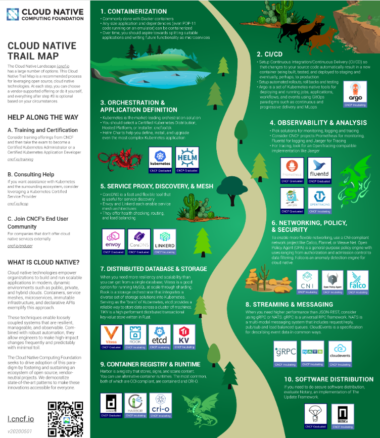 클라우드 네이티브 인터랙티브 랜드스케이프는 다양한 기술들이 나열되어 있으므로 어디서부터 시작해야 할 지 갈피를 못 잡을 수 있다. 클라우드 네이티브 트레일 맵을 통해 기술도입 순서를 판단하기 위한 도움을 받을 수 있다.